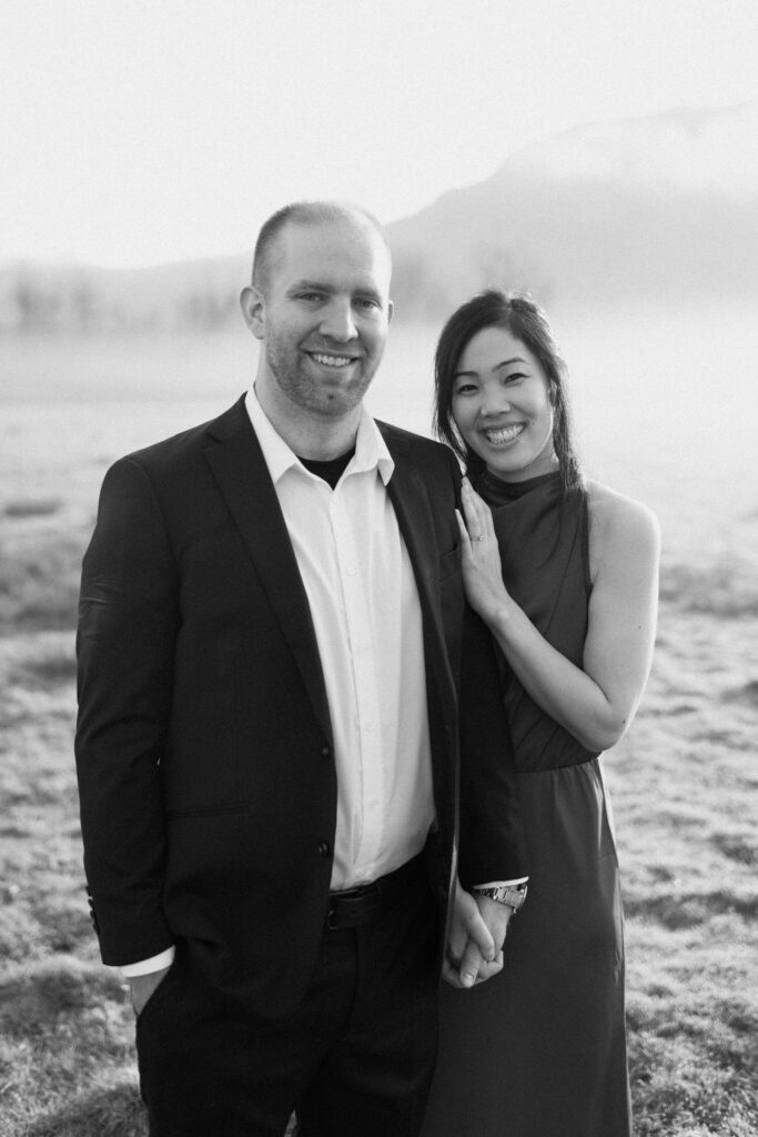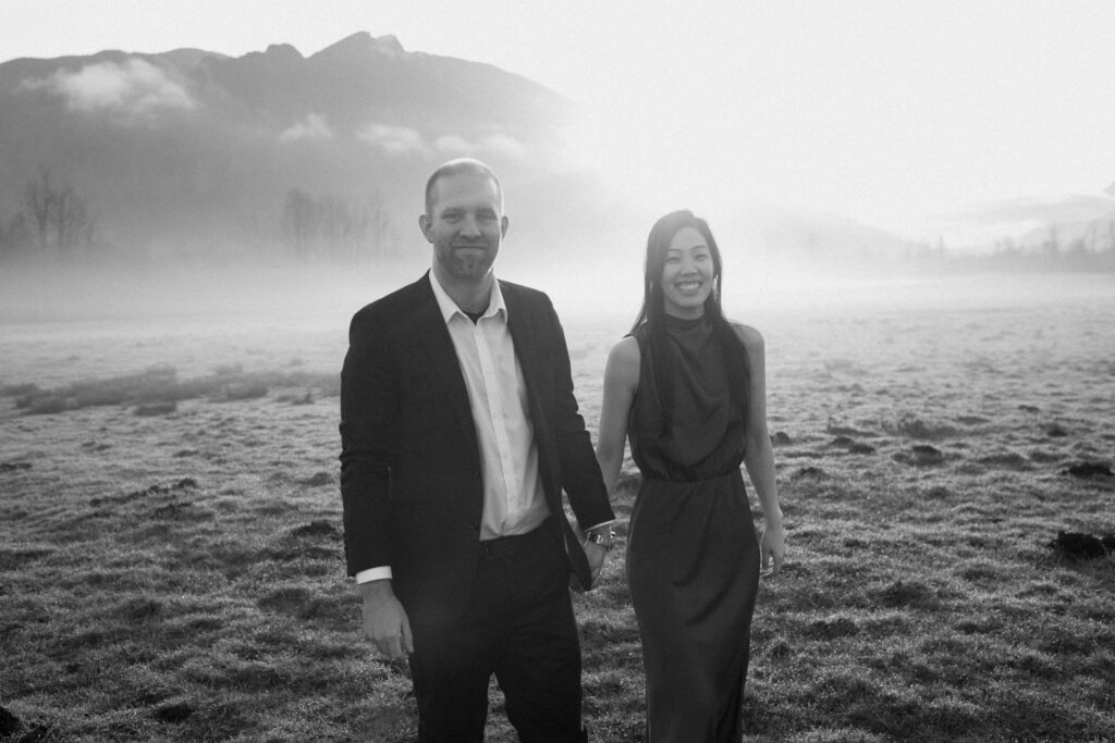 I definitely highly recommend sunrise for this specific engagement photo location. Because the sun rises behind the mountain, the prettiest side and backlighting is going to be in the early morning. Sunrise is also going to be the only time of day we can consistently get mist like this as the dew burns off the field!