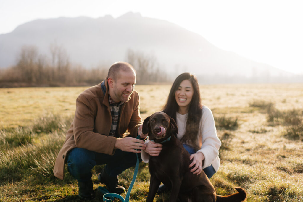 Alison and Neil needed to do their photos with enough time to get save the dates out in early March, so we wanted to find an engagement photo location near North Bend, Washington that would look beautiful even at the end of February. This field ended up being absolutely perfect for their session! We planned a sunrise session, and that was the best decision we could have possibly made. I arrived early, while it was still dark, so that I could do some scouting around North Bend and Snoqualmie area. The sky went through three really distinct phases — dark blue, BRILLIANT pink, and then this beautiful golden sunrise that lit up the field as the sun rose over Mount Si. My favorite part was the mist, though. It created such a gorgeous effect and really brought the magic!
